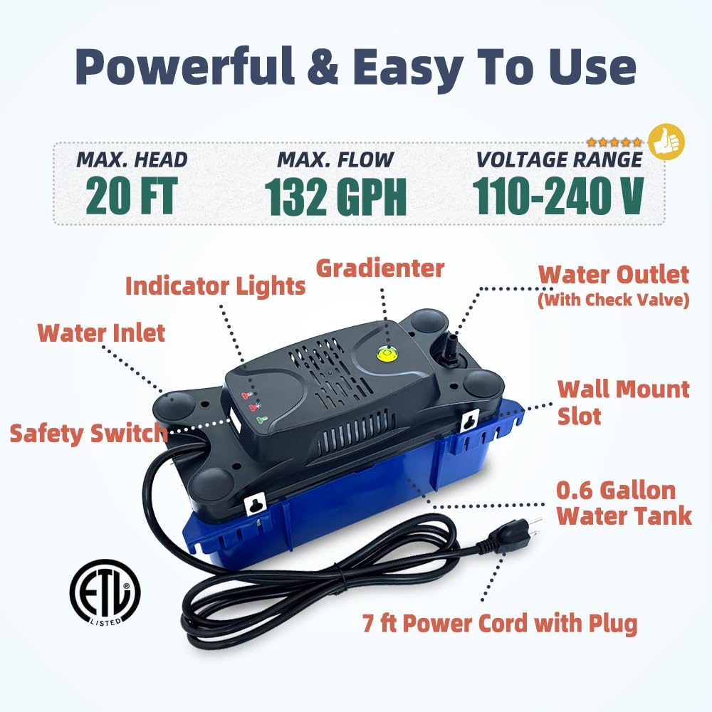 1/30 HP 132 GPH 20 FT HVAC Condensate Pump with 20 FT Tubing , 115V/230V w/Automatic Safety Switch, Removal Drain Pump for Heat-pump and A/C systems
